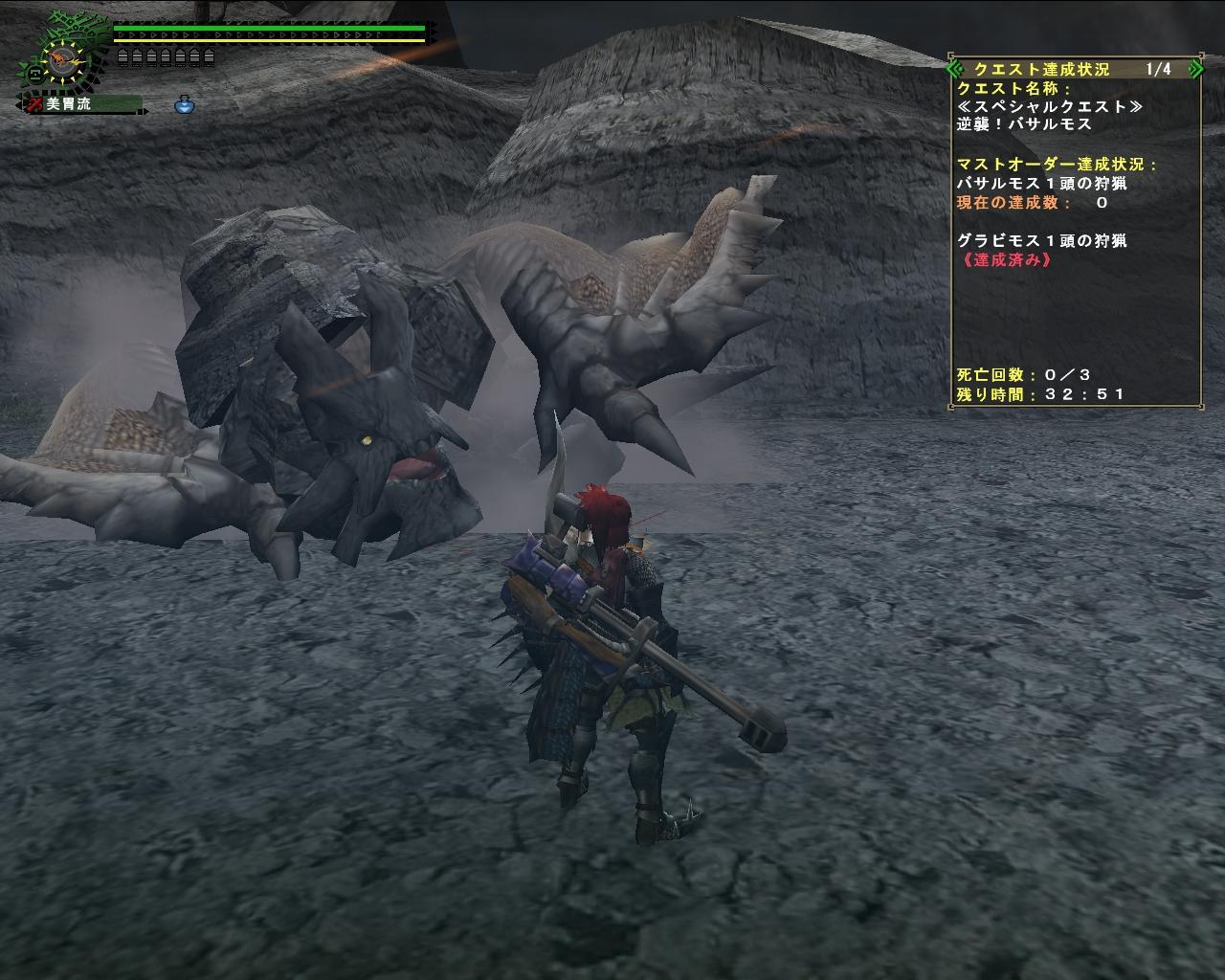 えと、大きい声では言えませんが、火山7で、火事場ディスティでハメてきました。持ち込みアイテムと装備載せておきます。調合マイナスついてなければ本は1冊減らしてもOKだと思います。ソロでの参考になればいいかなと思います。とりあえず、最初は拡散1.2、徹甲1.2を撃ち、貫通2.3と撃ちきったところでグラビモスがエリア移動しました。その間にまだ蜂がいたので通常2で退治しておきました。10分針を過ぎて11分ぐらい経過したらグラビモスが戻ってくるので、今度はマヒ弾1を12発最初に打ち込みまして、次に毒弾1を12発撃ちこみます。マヒ中はダメが1.1倍だったはずなので、なるべく多く撃ちこみましょう。で、後は貫通1を60発撃つぐらいでサブA達成しまして、残りカラ・ラン調合で120発ぐらい撃つとグラビモスは瀕死でエリア移動していきます。そしたら高台から下に降りて溶岩でHP削って1死します。サブAの支給品に捕獲用の落とし穴と捕獲ナイフ×3あります。HPが心配でしたら秘薬もあるので使っておきましょう。BC隣りのエリア4で待っていると、グラビモスがやってくるので捕獲して終了です。